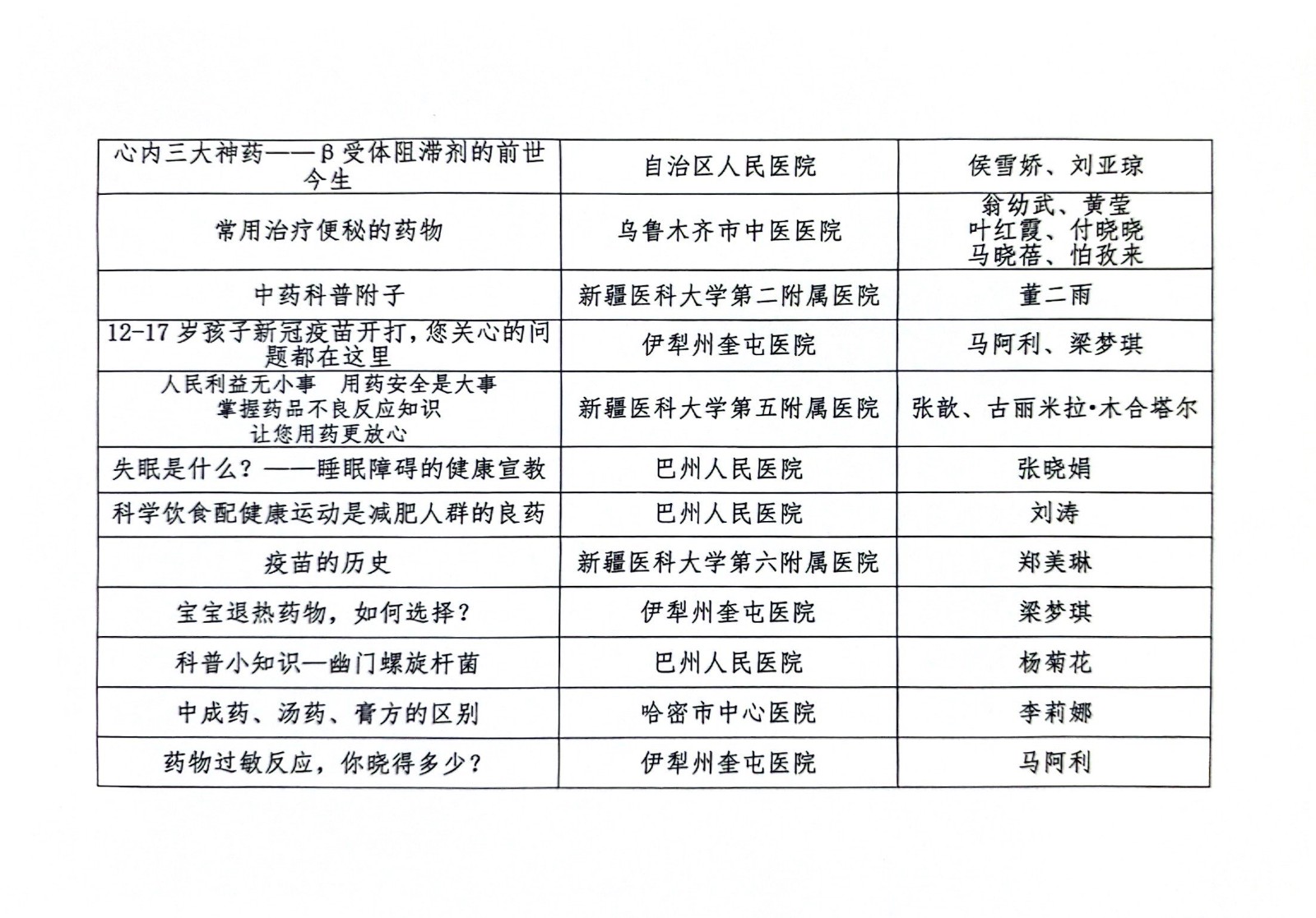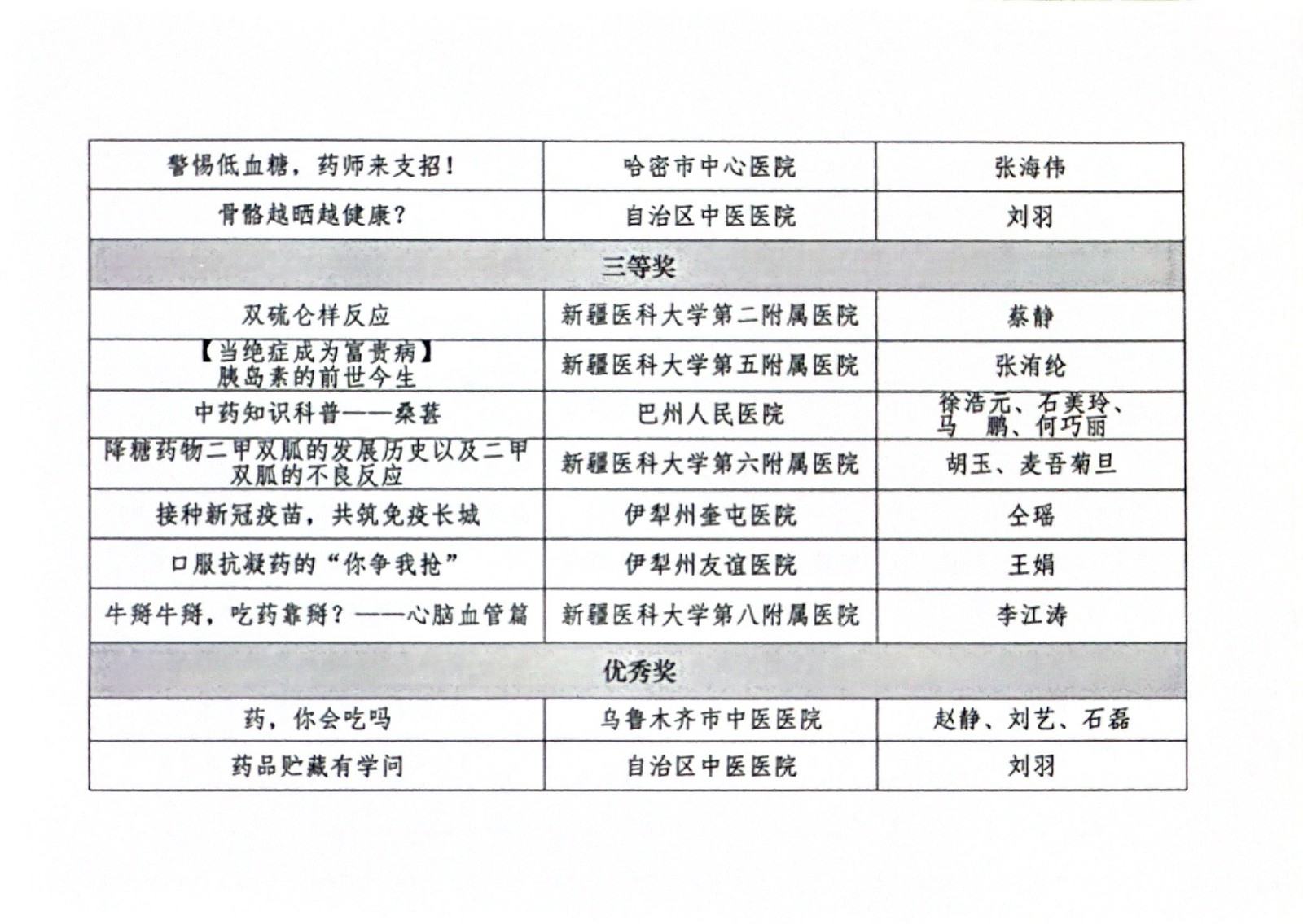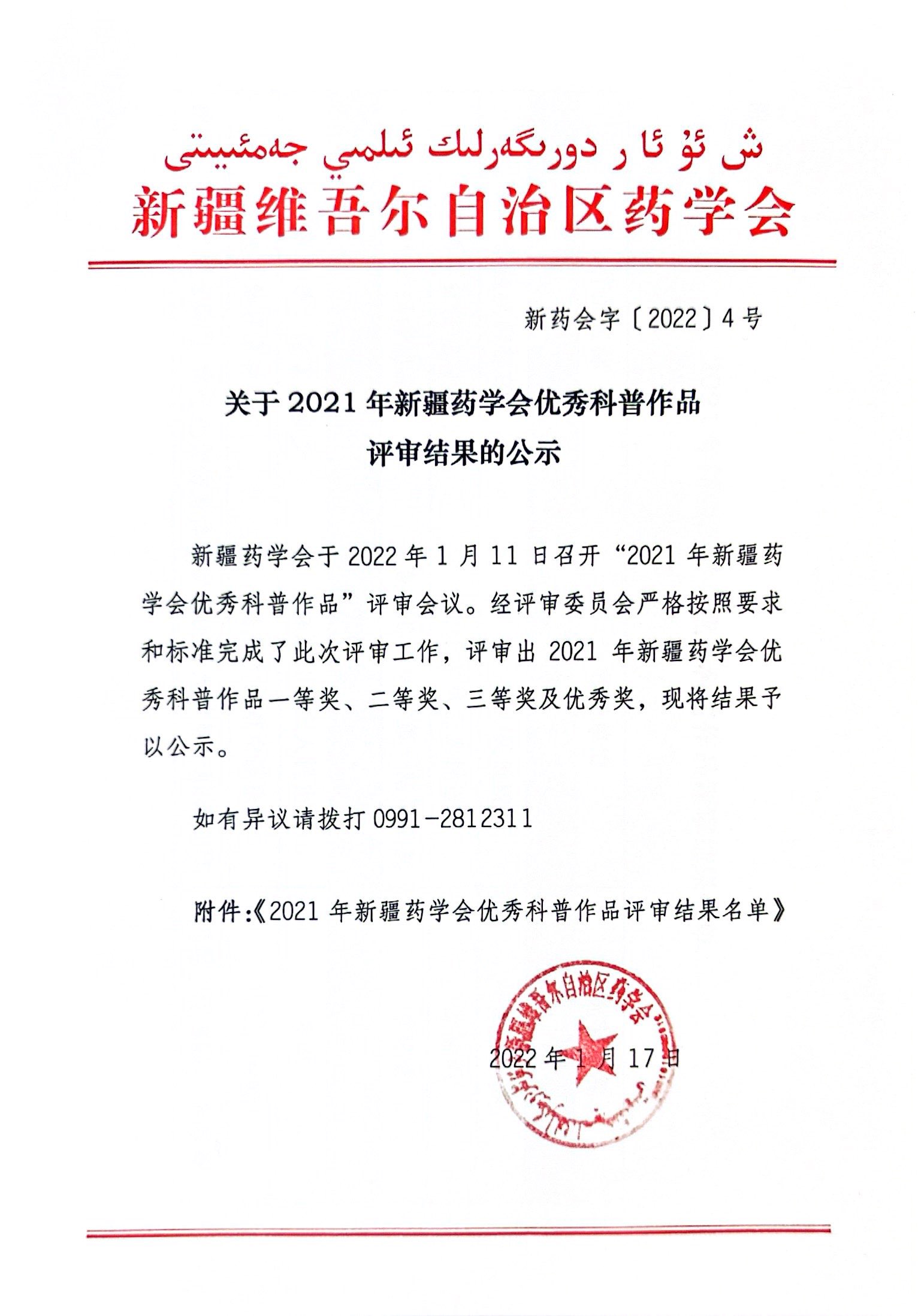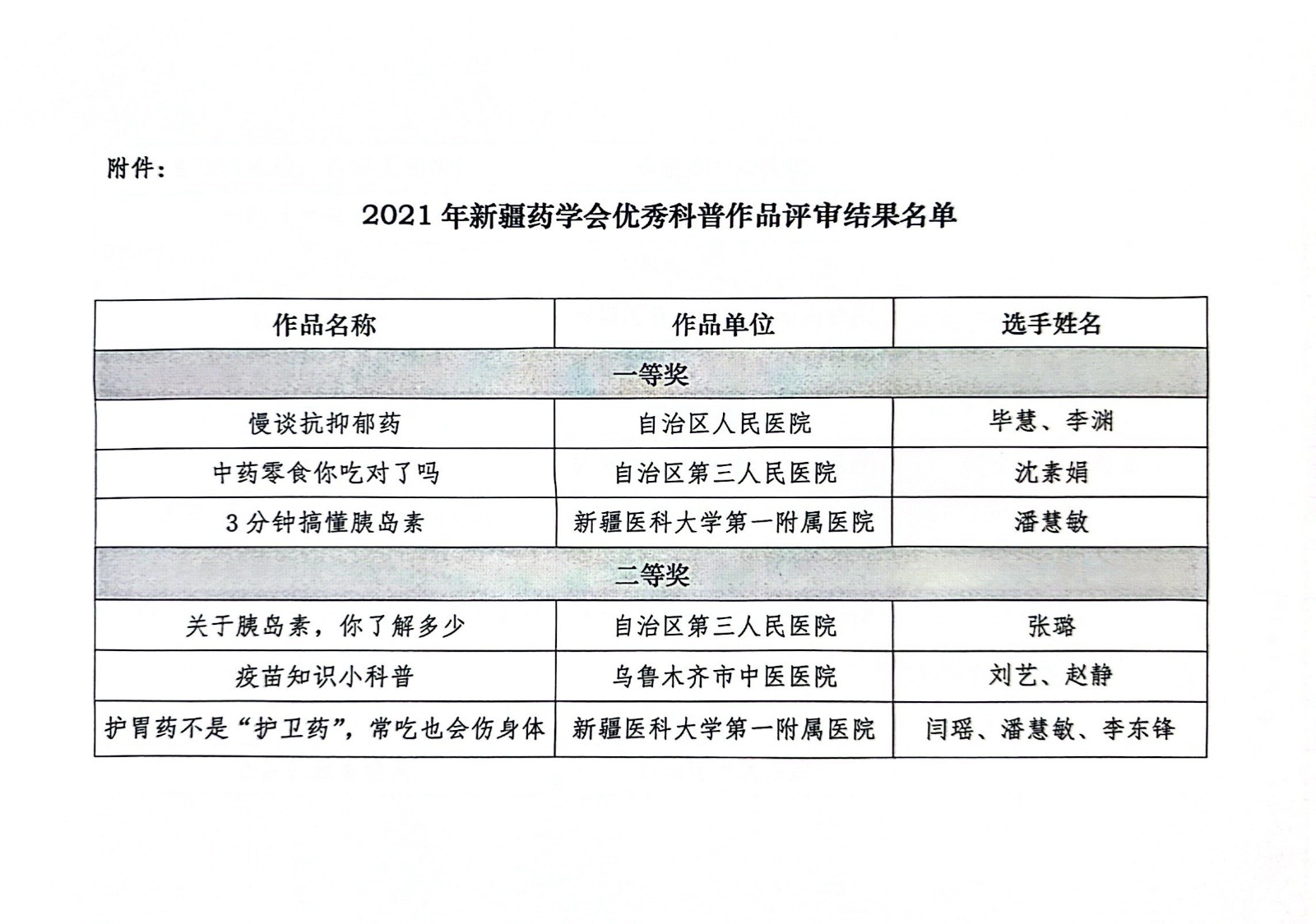 关于2021年新疆药学会优秀科普作品评审结果的公示
