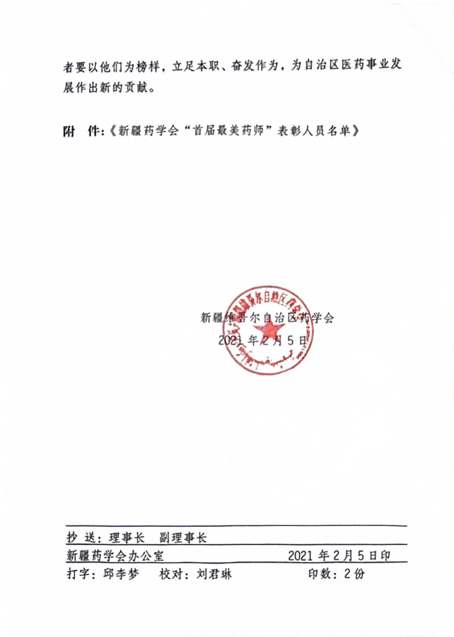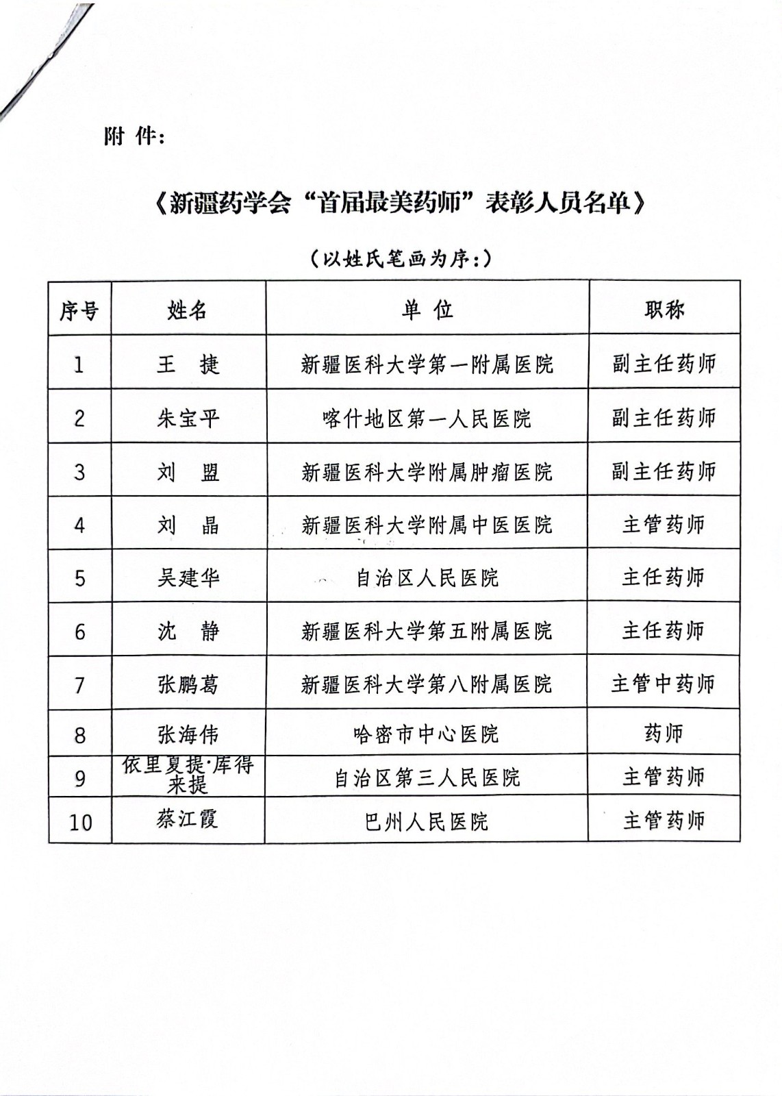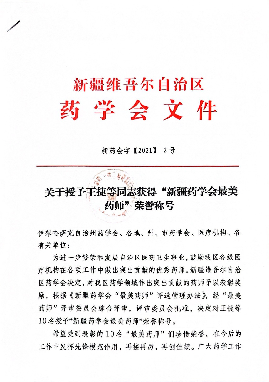 关于授予王捷等同志获得“新疆药学会最美药师”荣誉称号
