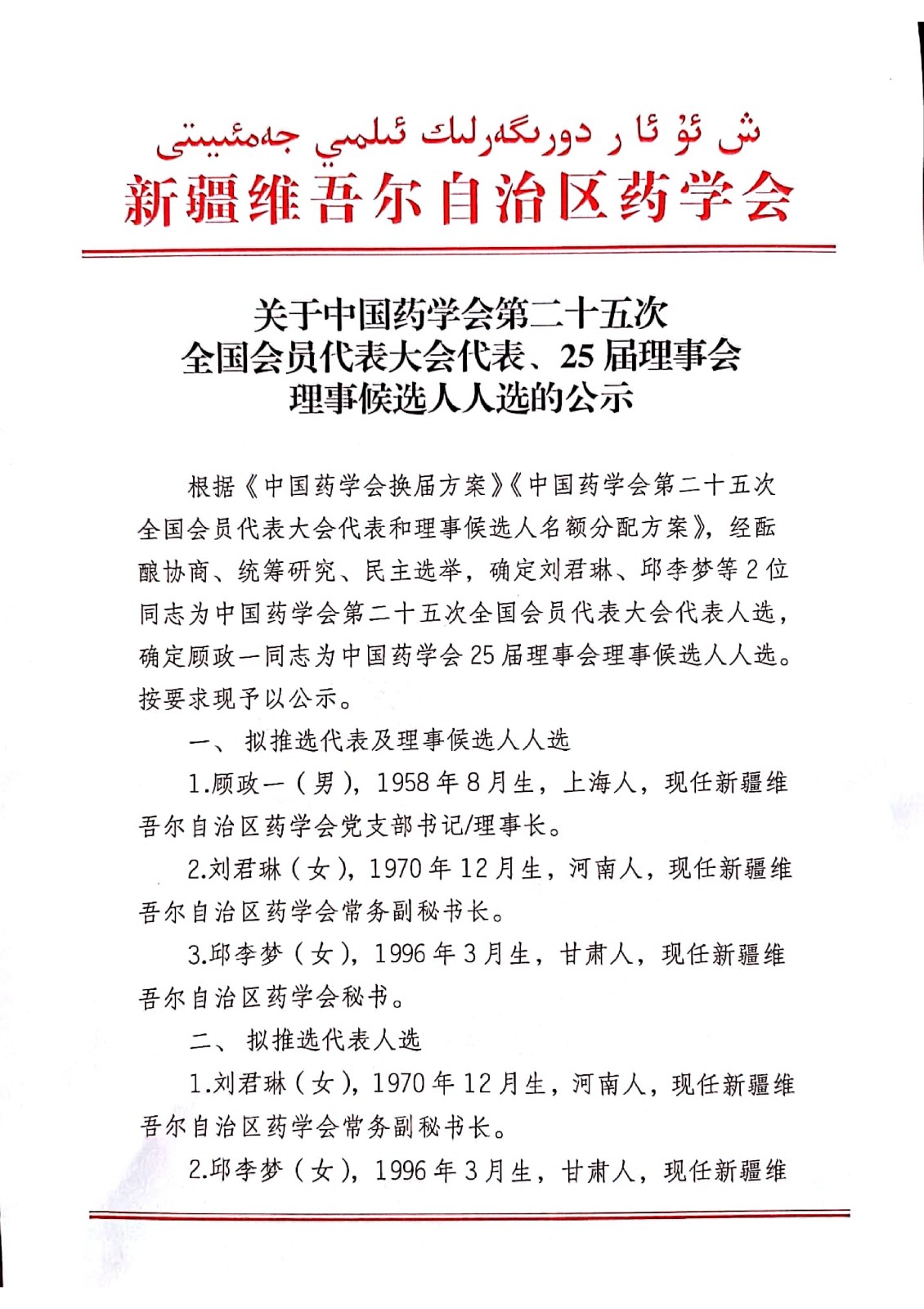 关于中国药学会第二十五次全国会员代表大会代表、25届理事会理事候选人人选的公示