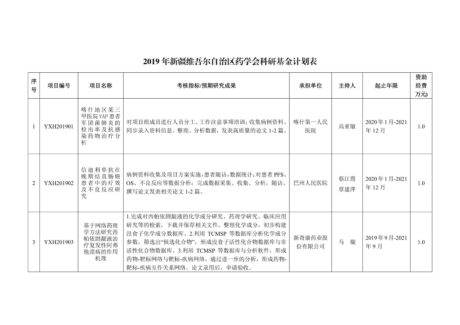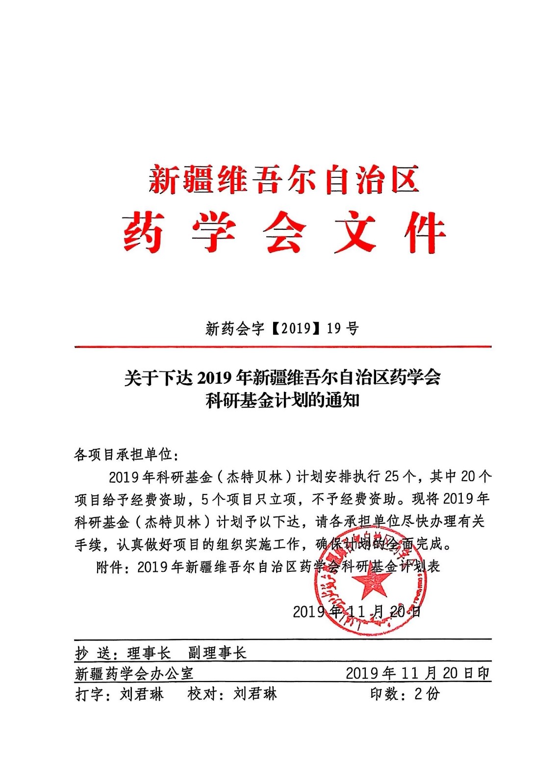 关于下达2019年新疆维吾尔自治区药学会科研基金计划的通知