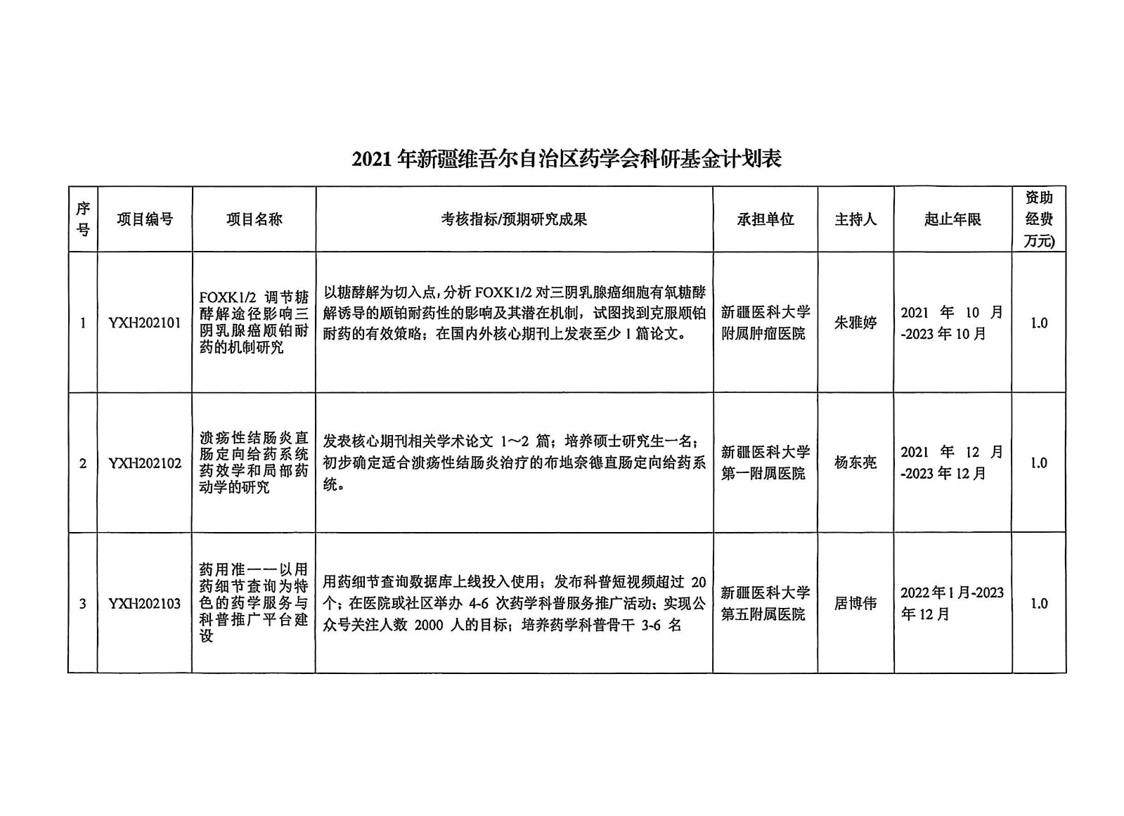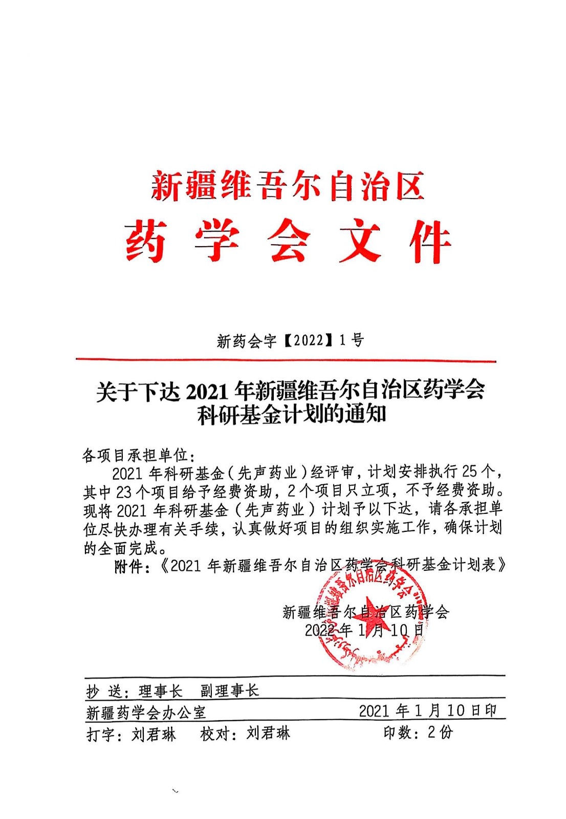 关于下达2021年新疆维吾尔自治区药学会科研基金计划的通知