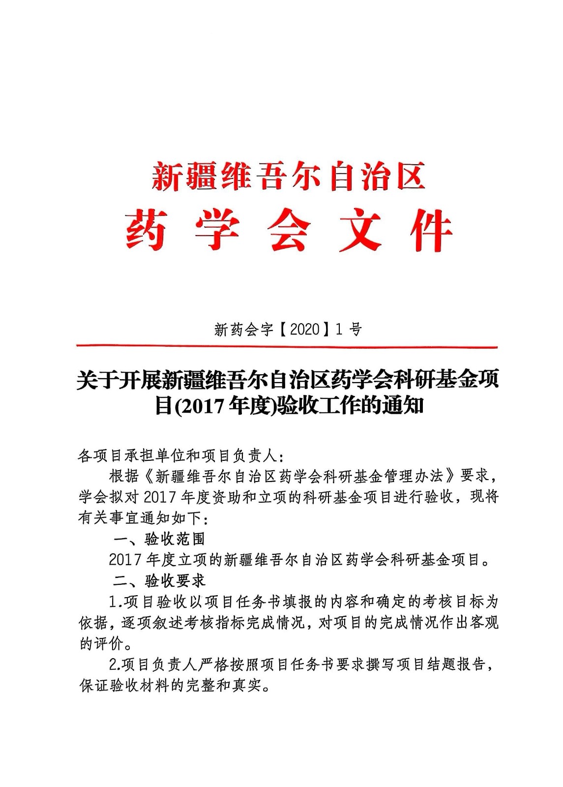 关于开展新疆维吾尔自治区药学会科研基金项目(2017年度)验收工作的通知