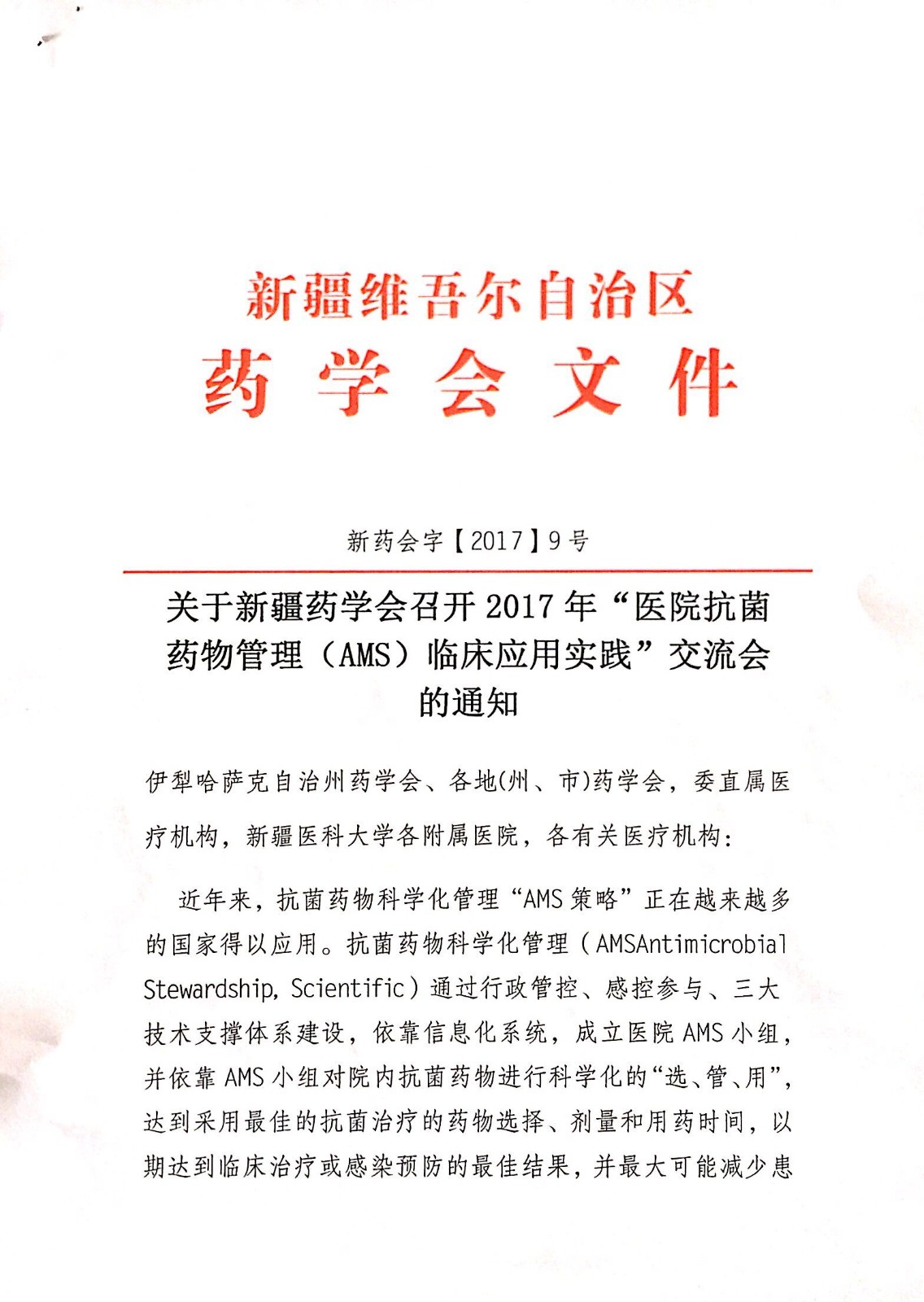 关于新疆药学会召开2017年“医院抗菌药物管理(AMS)临床应用实践”交流会的通知