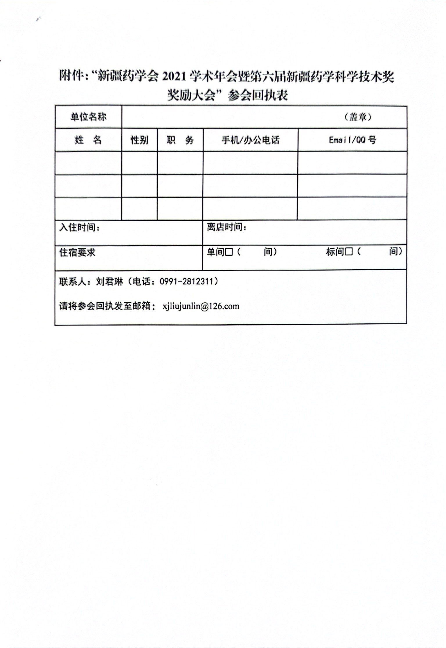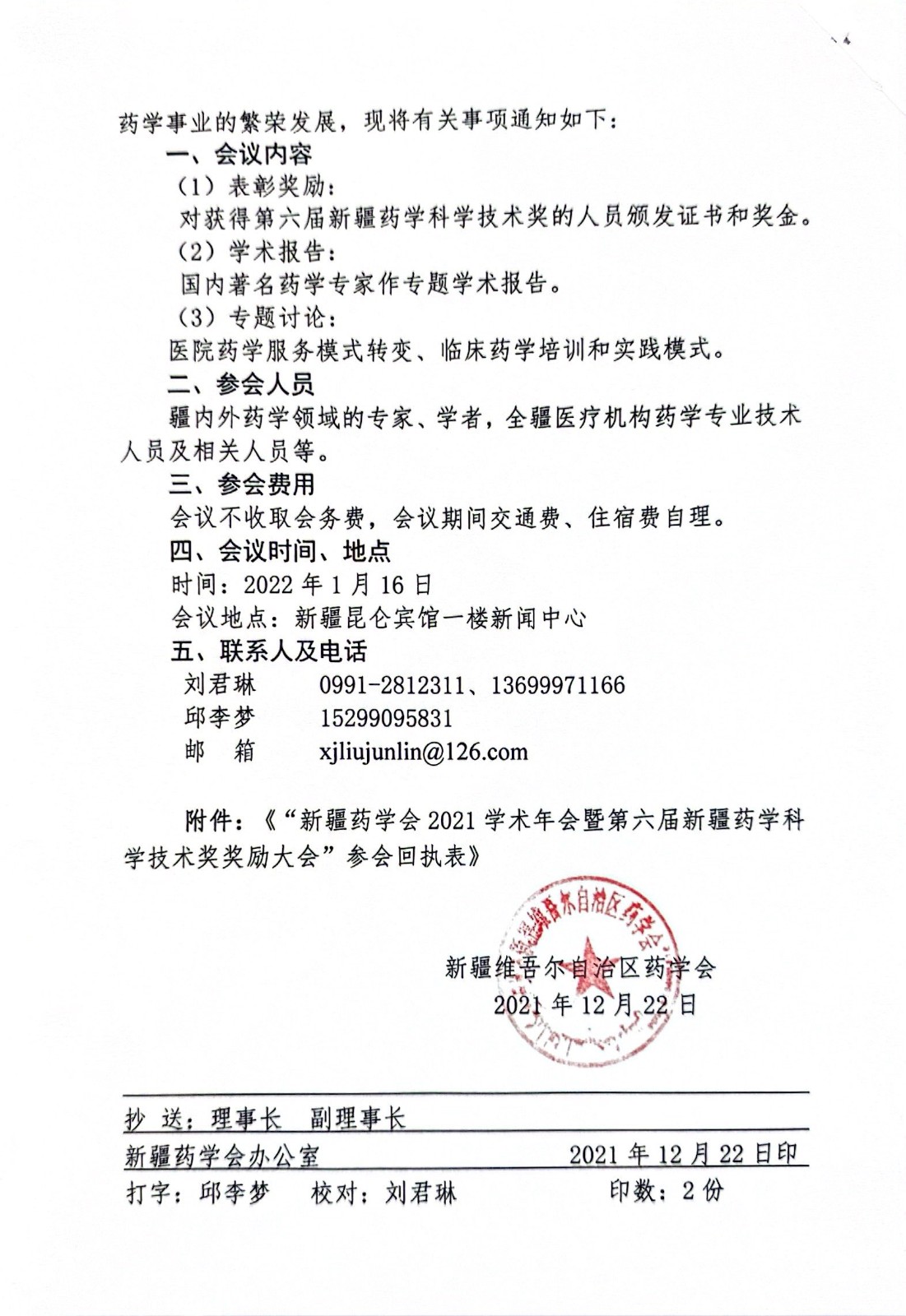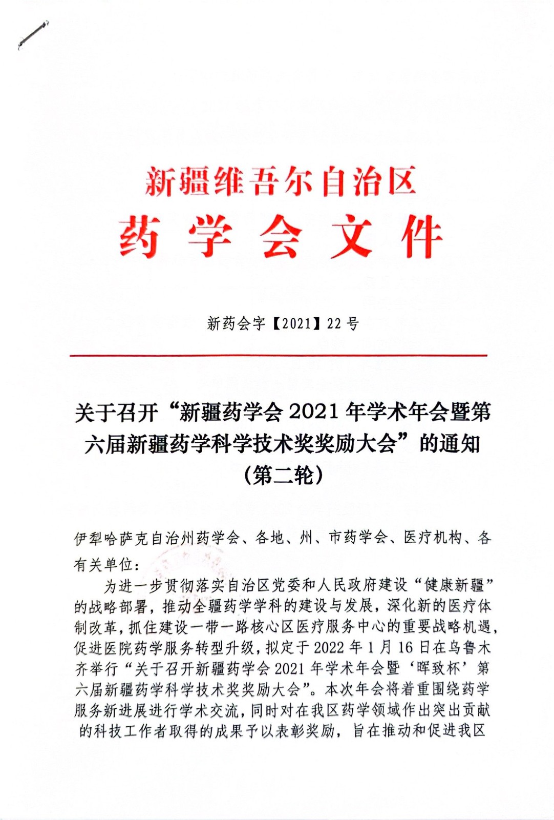 关于召开“新疆药学会2021年学术年会暨第六届新疆药学科学技术奖奖励大会”的通知(第二轮)
