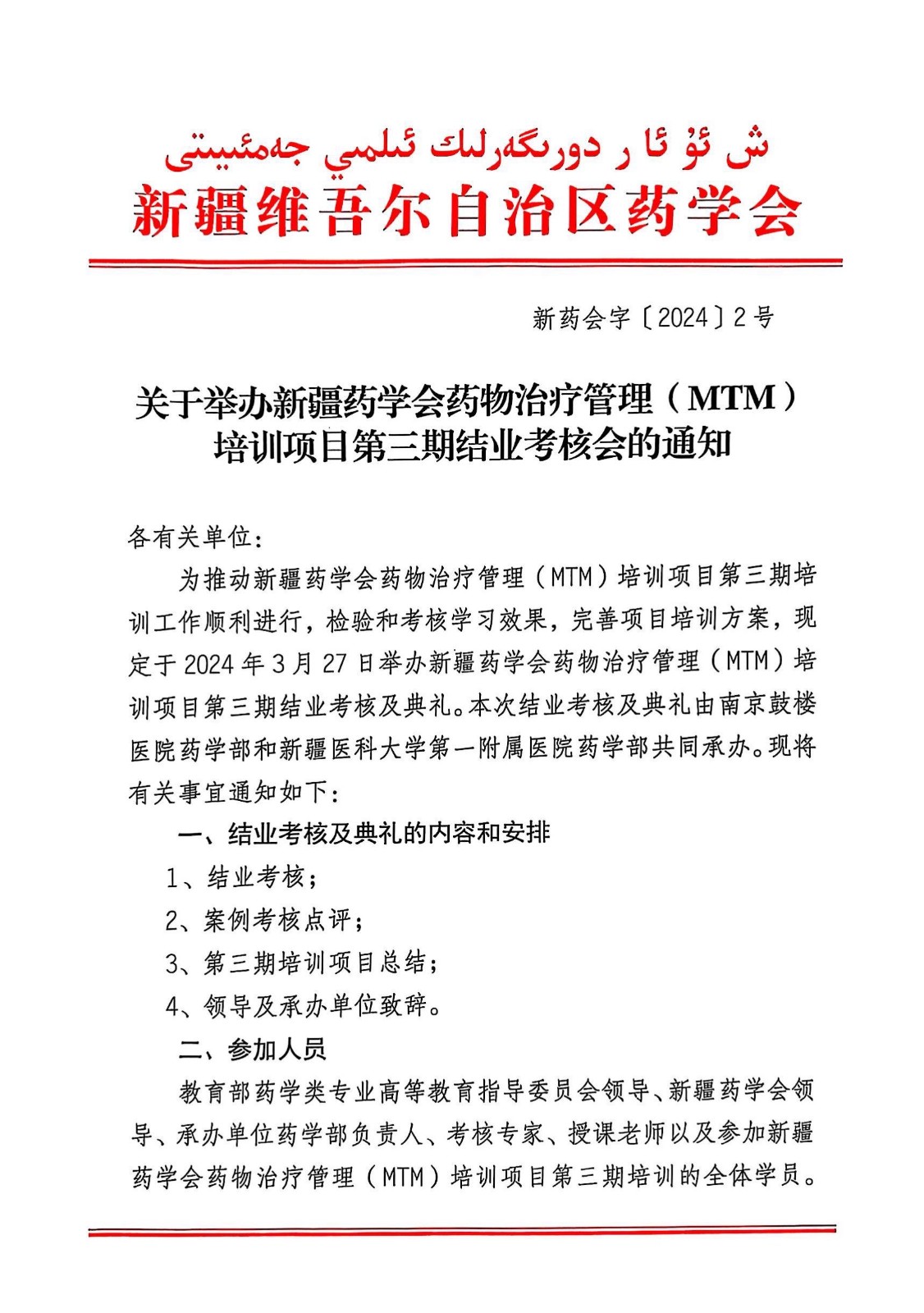 关于举办新疆药学会药物治疗管理(MTM)培训项目第三期结业考核会的通知