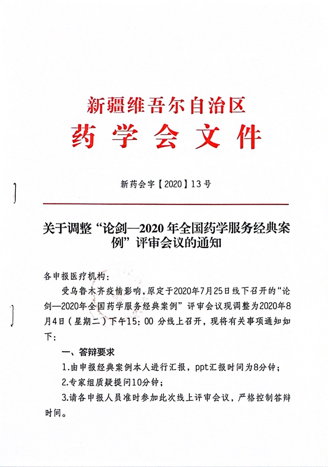 关于调整“论剑--2020年全国药学服务经典案例”评审会议的通知