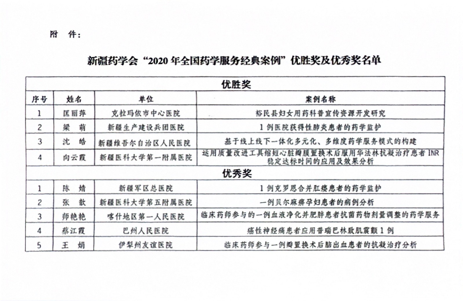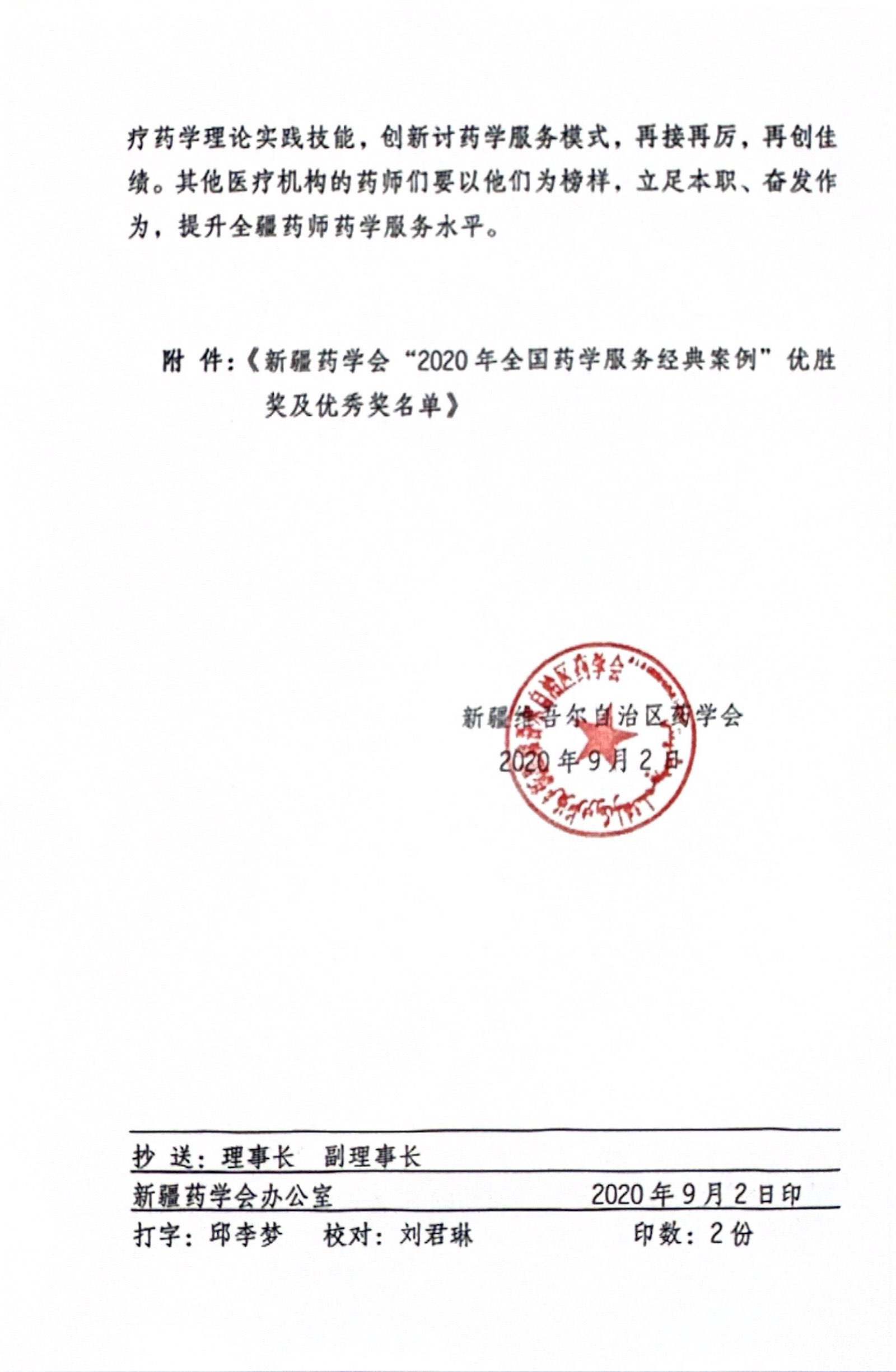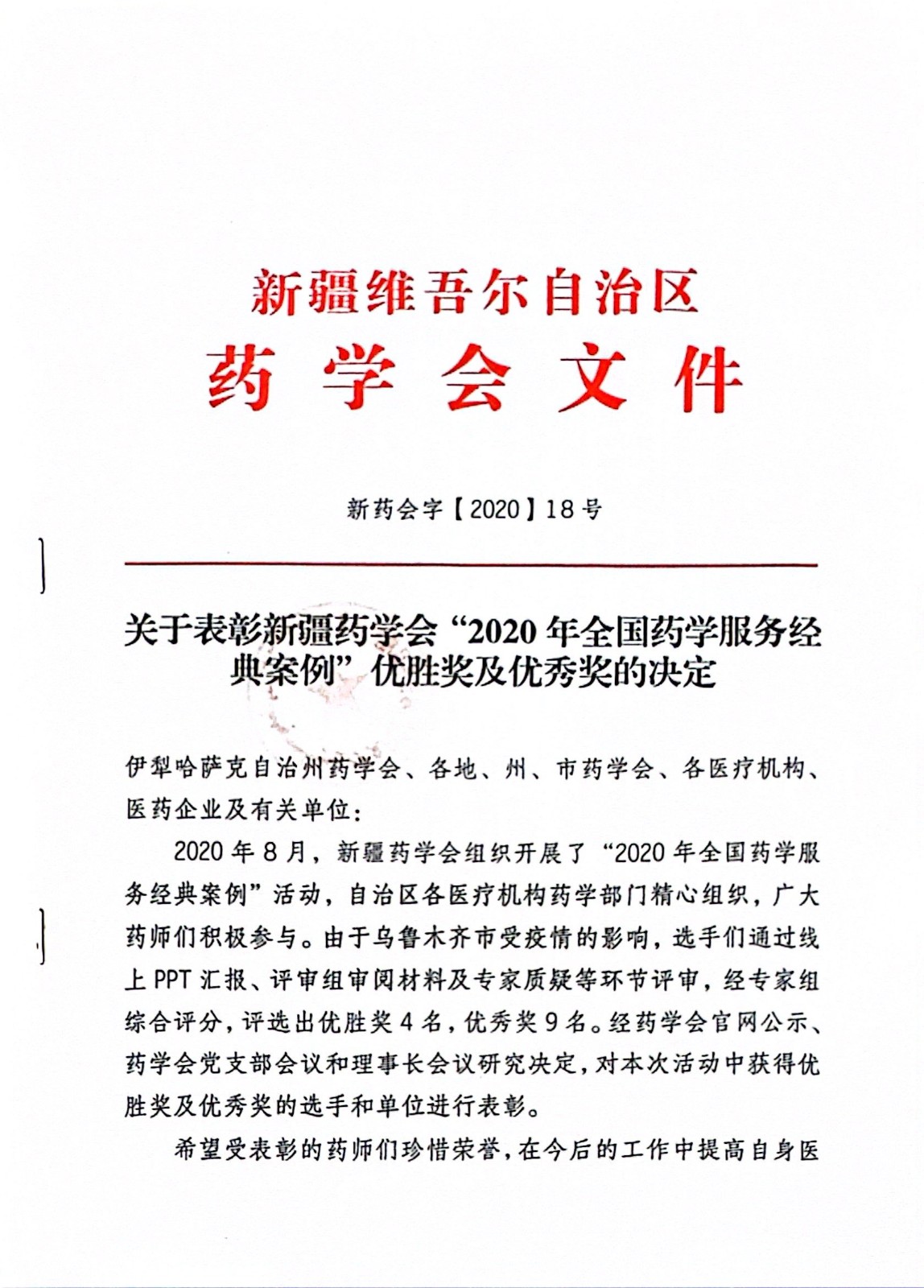 关于表彰新疆药学会“2020年全国药学服务经典案例”优胜奖及优秀奖的决定