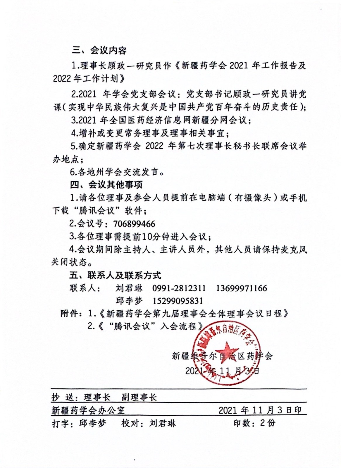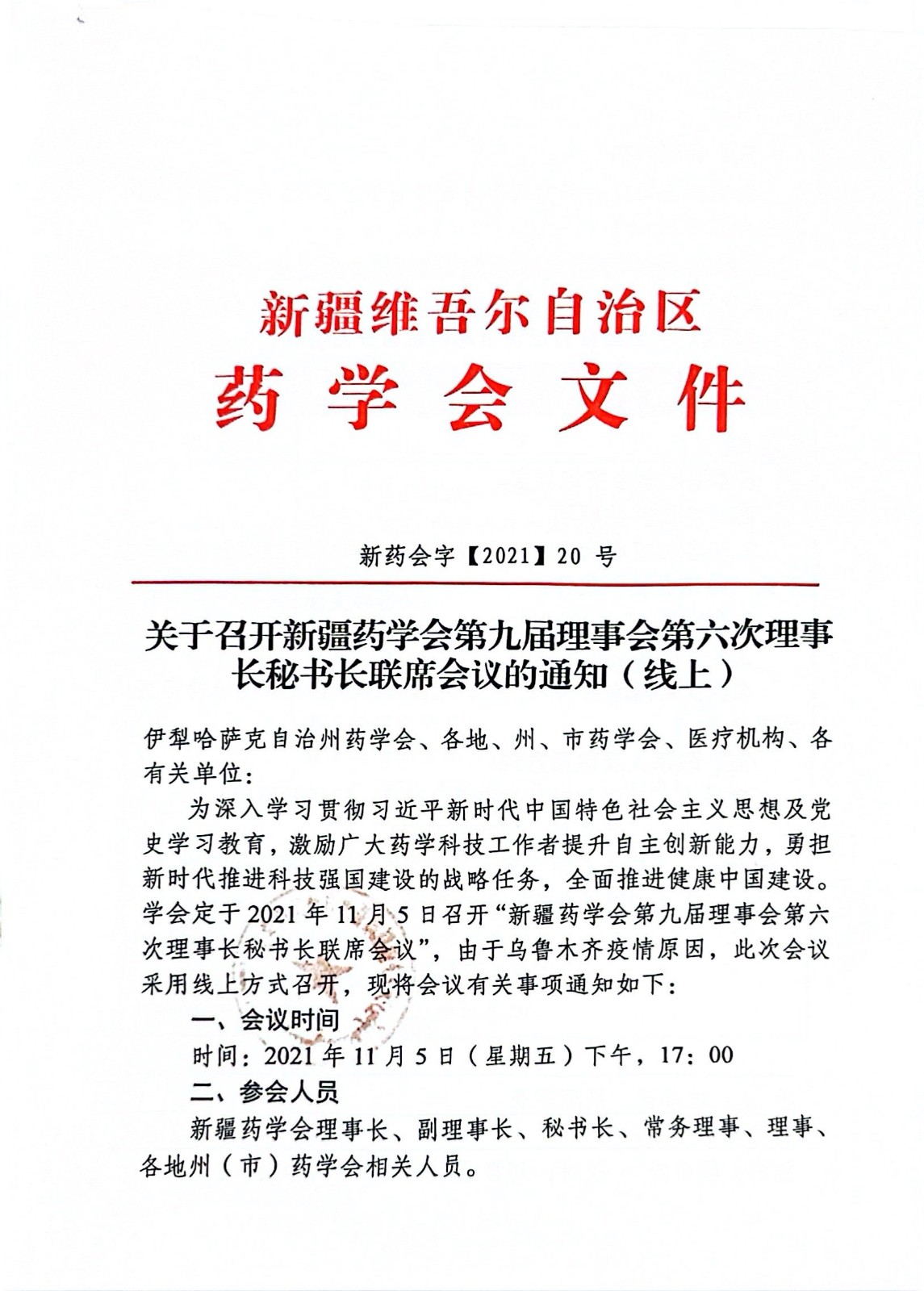 关于召开新疆药学会第九届理事会第六次理事长秘书长联席会议的通知(线上)