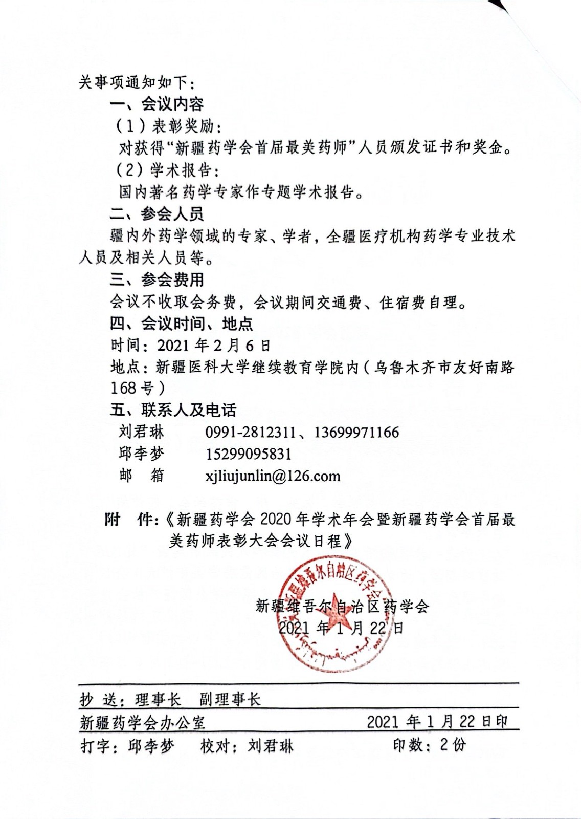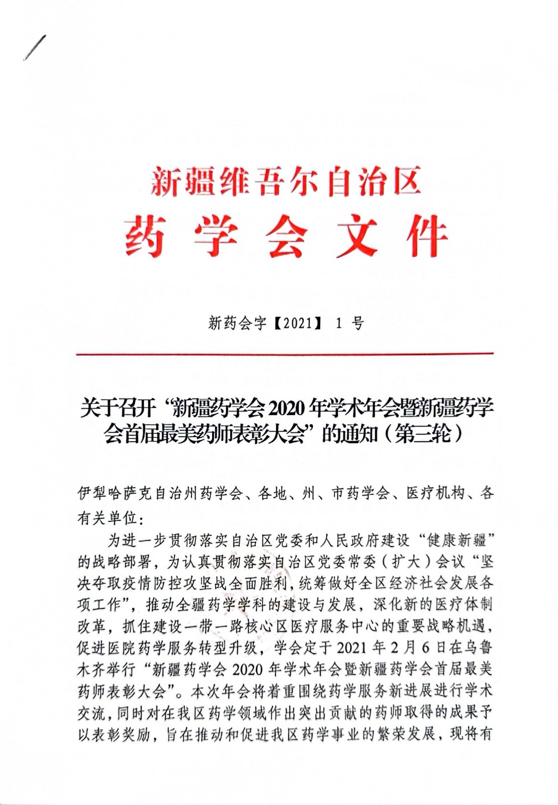 关于召开“新疆药学会2020年学术年会暨新疆首届最美药师表彰大会”的通知(第三轮)